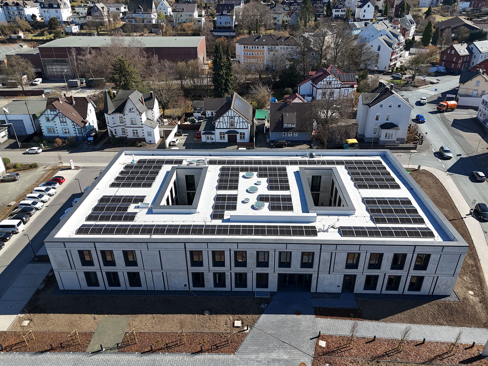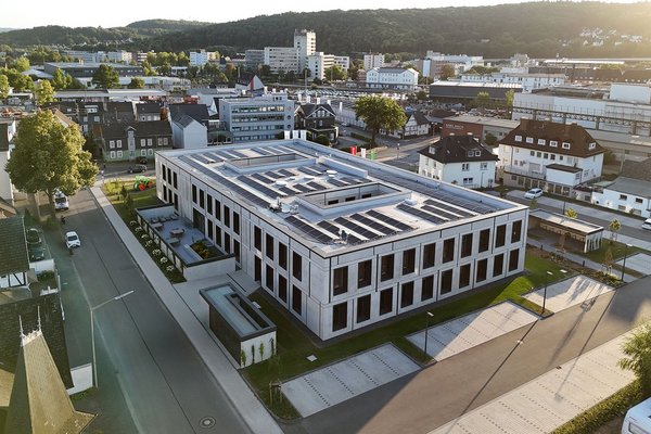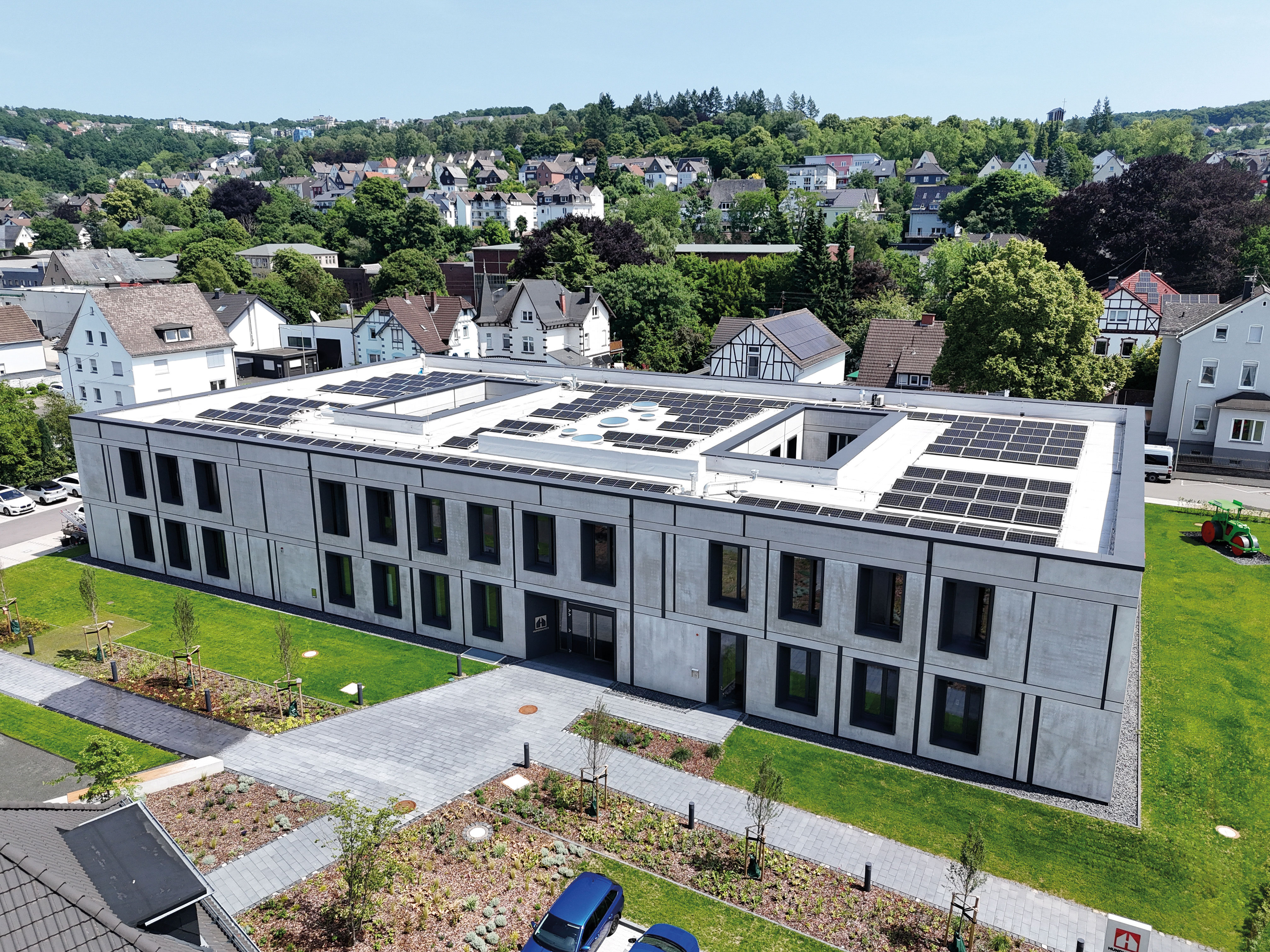 Mit dem zweigeschossigen Neubau unserer Hauptverwaltung in Siegen setzen wir einen Meilenstein in Sachen Nachhaltigkeit und moderner Arbeitswelt. In unserem teilunterkellerten Plus-Energie-Gebäude am Stockweg 4 in Siegen-Weidenau finden rund 130 Beschäftigte optimale Arbeitsbedingungen. Die Baustoffe Beton, Stahl, Holz, Aluminium und Glas sind harmonisch nach einem naturnahen Energie-, Raum- und Farbkonzept aufeinander abgestimmt.