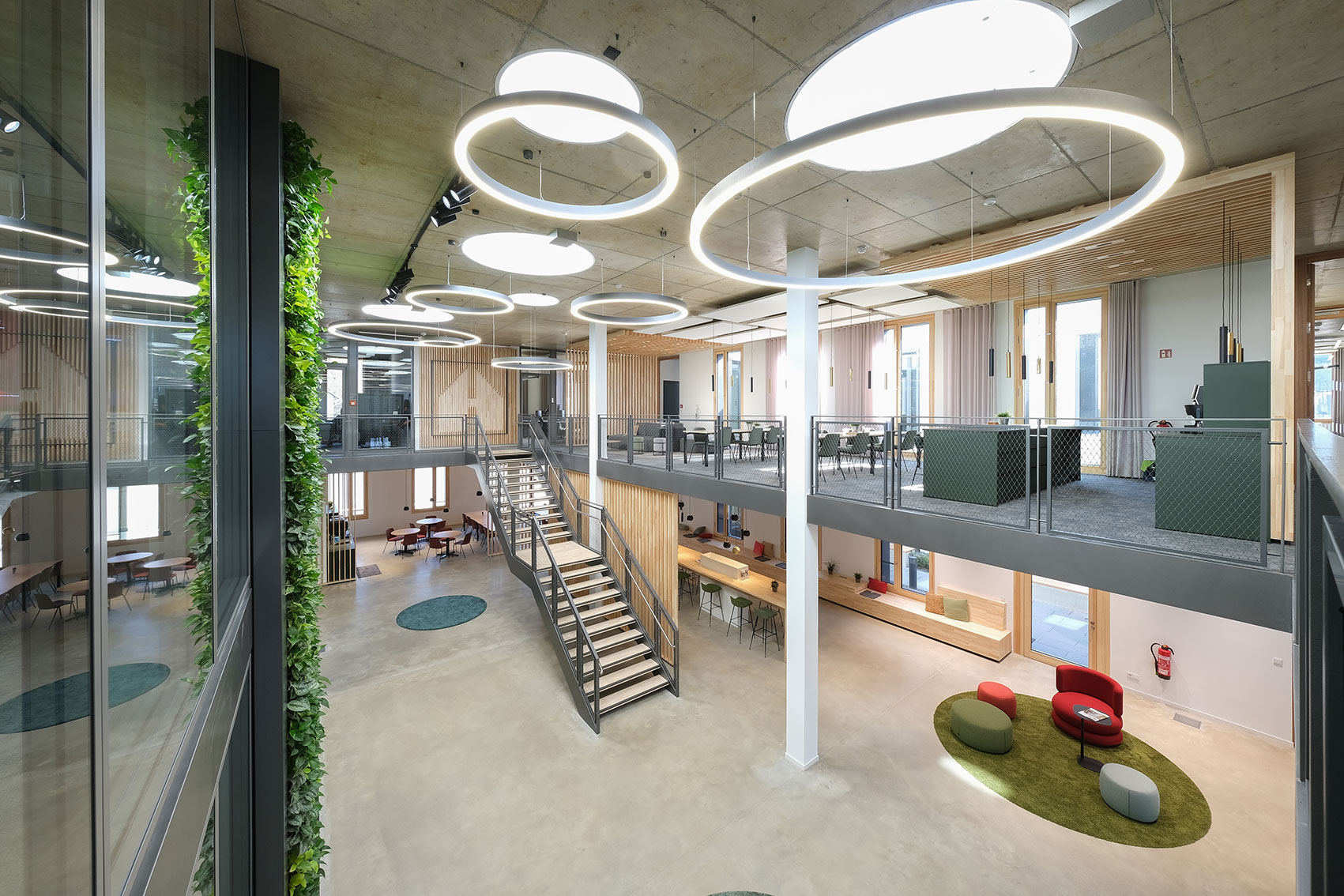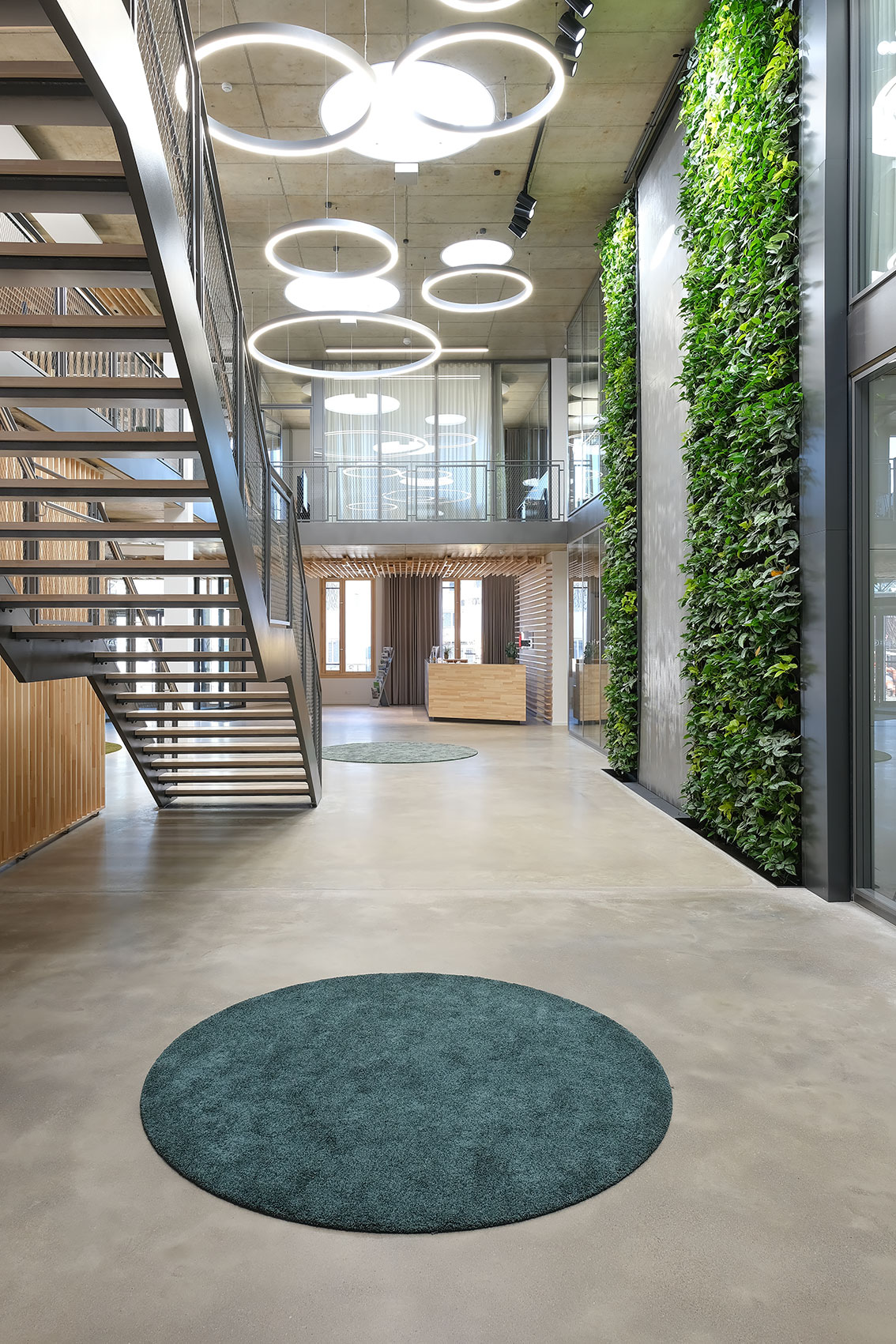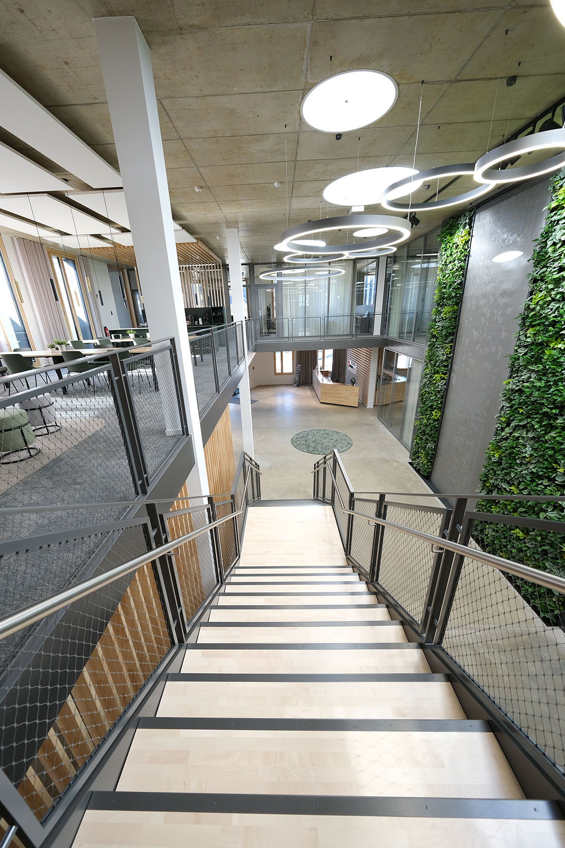 Schon beim Betreten unseres Gebäudes entsteht eine einladende, warme und freundliche Atmosphäre. Im großzügigen und hellen Eingangsbereich fällt der Blick auf eine 7 m hohe Wandbegrünung mit integrierter Wasserwand – ein besonderer Blickfang und Symbol für unsere Verbindung von Natur und Technik. Das Foyer geht fließend in die offenen, lichtdurchfluteten Gemeinschaftsbereiche im Erd- und Obergeschoss über, die zum Verweilen und Austauschen einladen. Viel natürliches Licht gelangt über Außenfenster und Lichthöfe in das Gebäude und prägt die Innenräume. Unsere ergonomischen, schallgedämmten Arbeitsplätze sind überwiegend als Einzel- oder Doppelbüros konzipiert und mit modernster digitaler Infrastruktur ausgestattet.