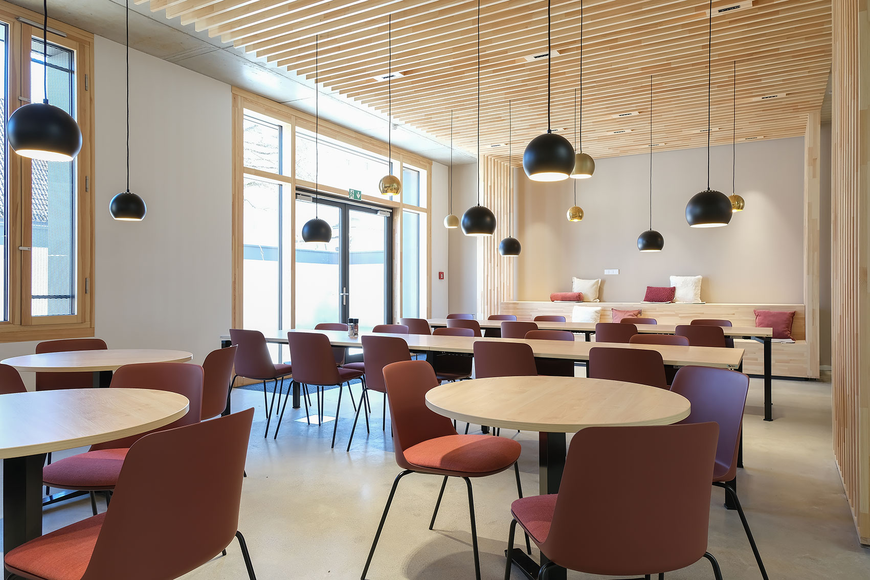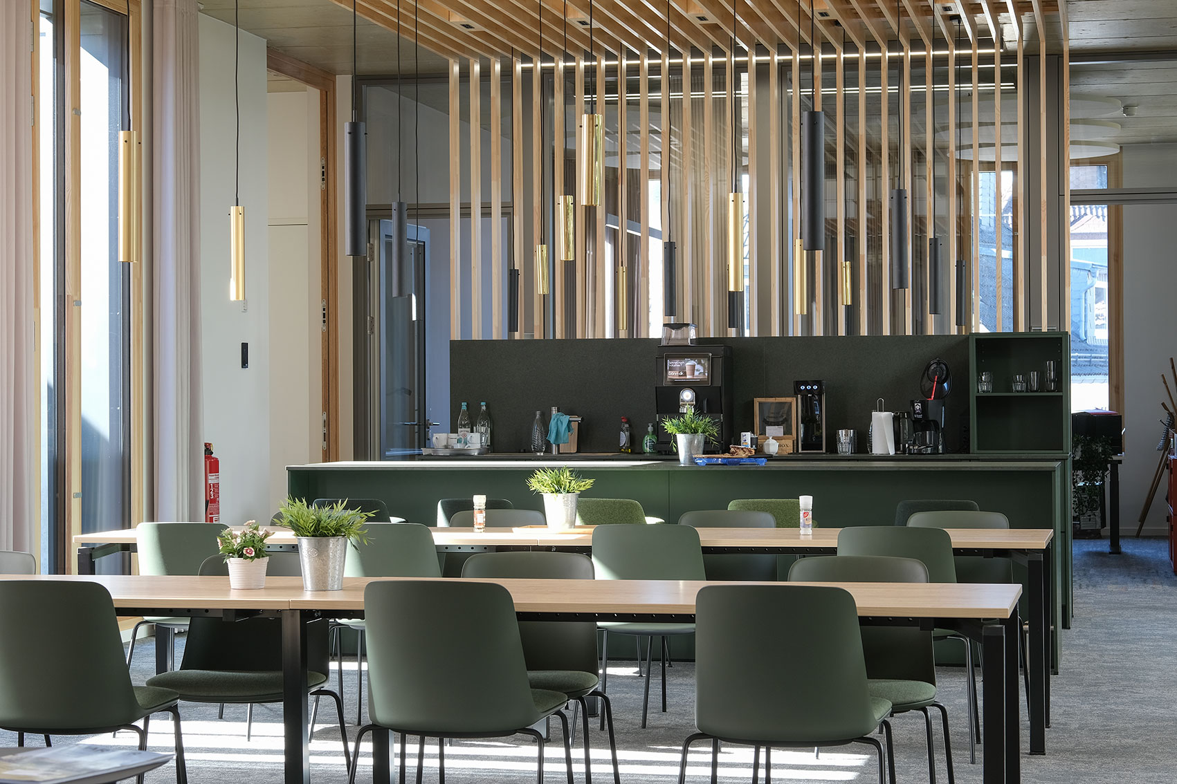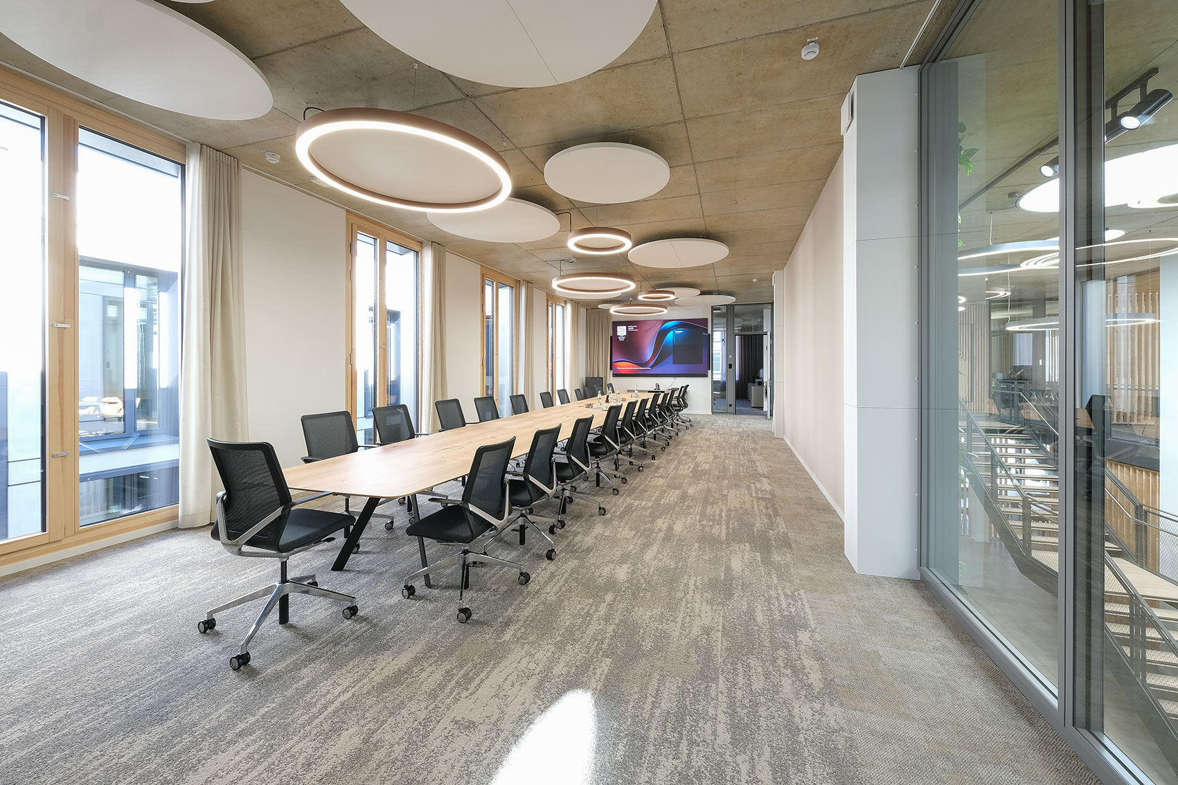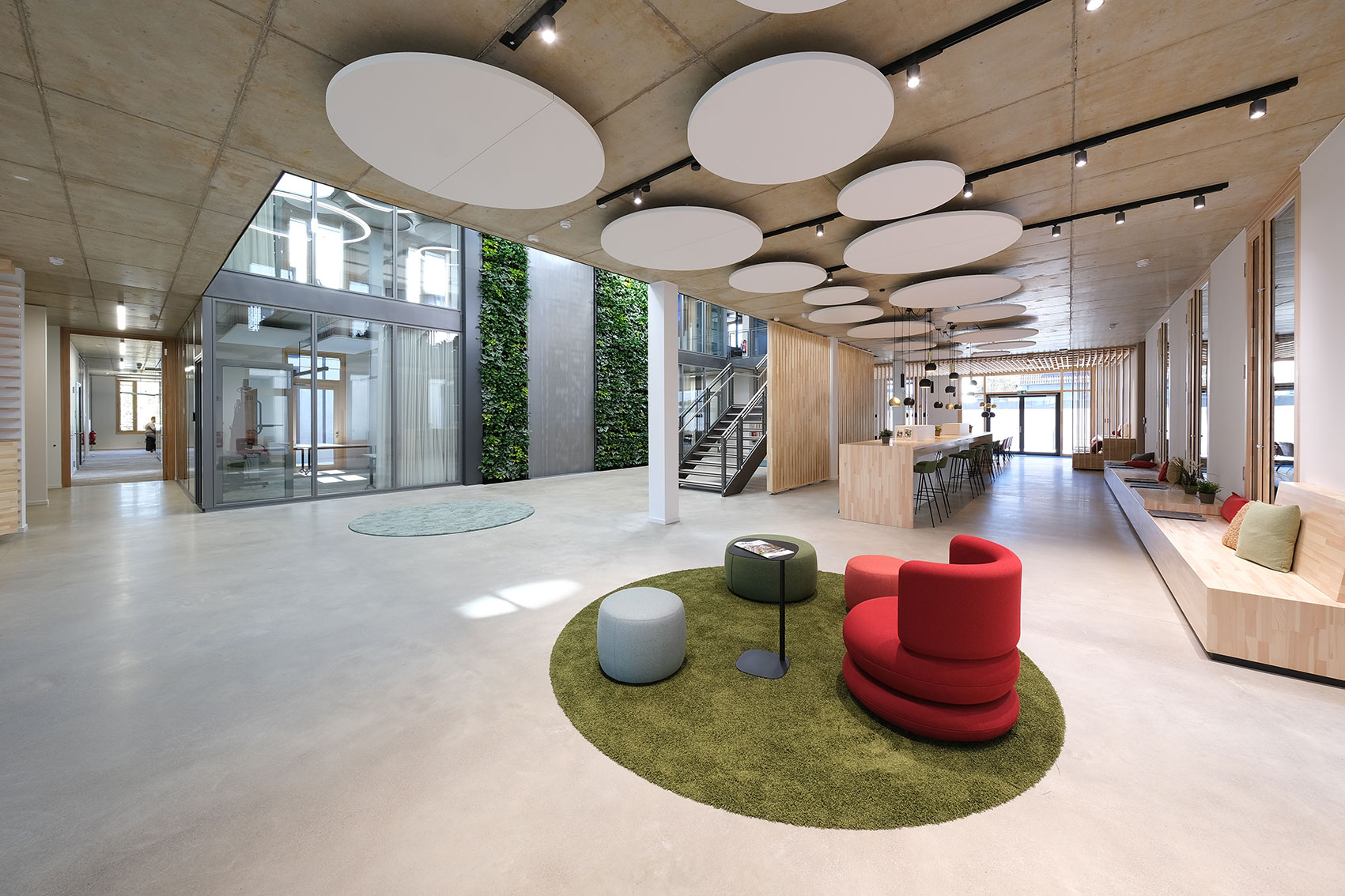 Schon beim Betreten unseres Gebäudes entsteht eine einladende, warme und freundliche Atmosphäre. Im großzügigen und hellen Eingangsbereich fällt der Blick auf eine 7 m hohe Wandbegrünung mit integrierter Wasserwand – ein besonderer Blickfang und Symbol für unsere Verbindung von Natur und Technik. Das Foyer geht fließend in die offenen, lichtdurchfluteten Gemeinschaftsbereiche im Erd- und Obergeschoss über, die zum Verweilen und Austauschen einladen. Viel natürliches Licht gelangt über Außenfenster und Lichthöfe in das Gebäude und prägt die Innenräume. Unsere ergonomischen, schallgedämmten Arbeitsplätze sind überwiegend als Einzel- oder Doppelbüros konzipiert und mit modernster digitaler Infrastruktur ausgestattet.