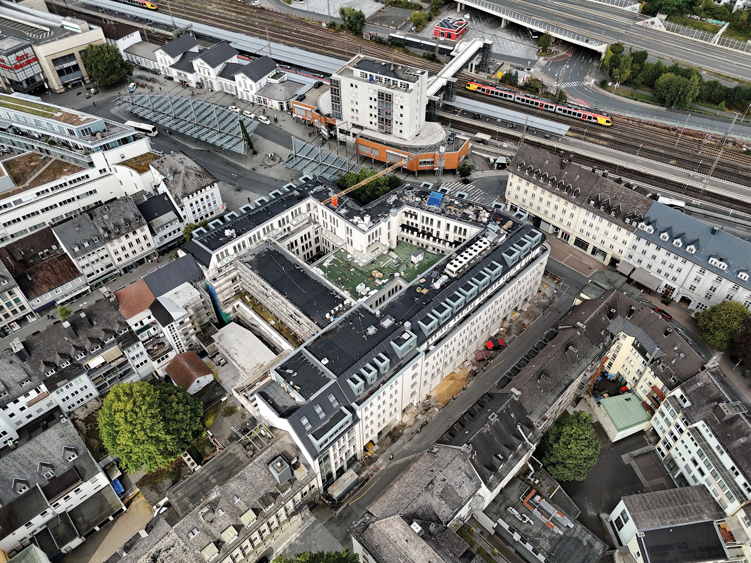 Der Gebäudekomplex verfügt über drei Tief- und sechs oberirdische Geschosse mit einer Bruttogeschossfläche von insgesamt 29.000 m². Im barrierefrei und offen gestalteten Erdgeschoss befinden sich Einzelhandel und Gastronomie. In den Etagen darüber befinden sich Büros, Praxisräume sowie 102 voll ausgestattete Mini-Appartements für Hotelgäste und Kurzzeitmieter. In den oberen Stockwerken entstanden exklusive Wohnungen, die über Laubengänge erschlossen werden und einen Blick auf die begrünten Lichthöfe und die Innenstadt bieten. Unterirdisch erstrecken sich auf drei Ebenen Tiefgaragen mit insgesamt 250 Stellplätzen. Besondere Herausforderungen des Projekts waren der Abbruch der früheren Gebäude, das Ausschachten einer elf Meter tiefen Baugrube sowie die enge Einbettung in eine bereits stark bebaute Innenstadtlage. Öffentliche Träger, darunter der Denkmalschutz, wurden intensiv in den Planungsprozess einbezogen, Gutachten zu Verkehr und Umwelt erstellt und ein historischer Tiefbunker zurückgebaut. Gleichzeitig konnte eine prägende Platane für den Bahnhofsvorplatz erhalten werden. Aufgrund der offenen Stützenkonstruktion in den Ladenlokalen war beim Verlegen sämtlicher Leitungen planerischer Einfallsreichtum gefragt. Außerdem spielte der Schallschutz eine besondere Rolle, da die oberen Wohnungen vor Lärm aus den Erdgeschosszonen geschützt werden mussten.