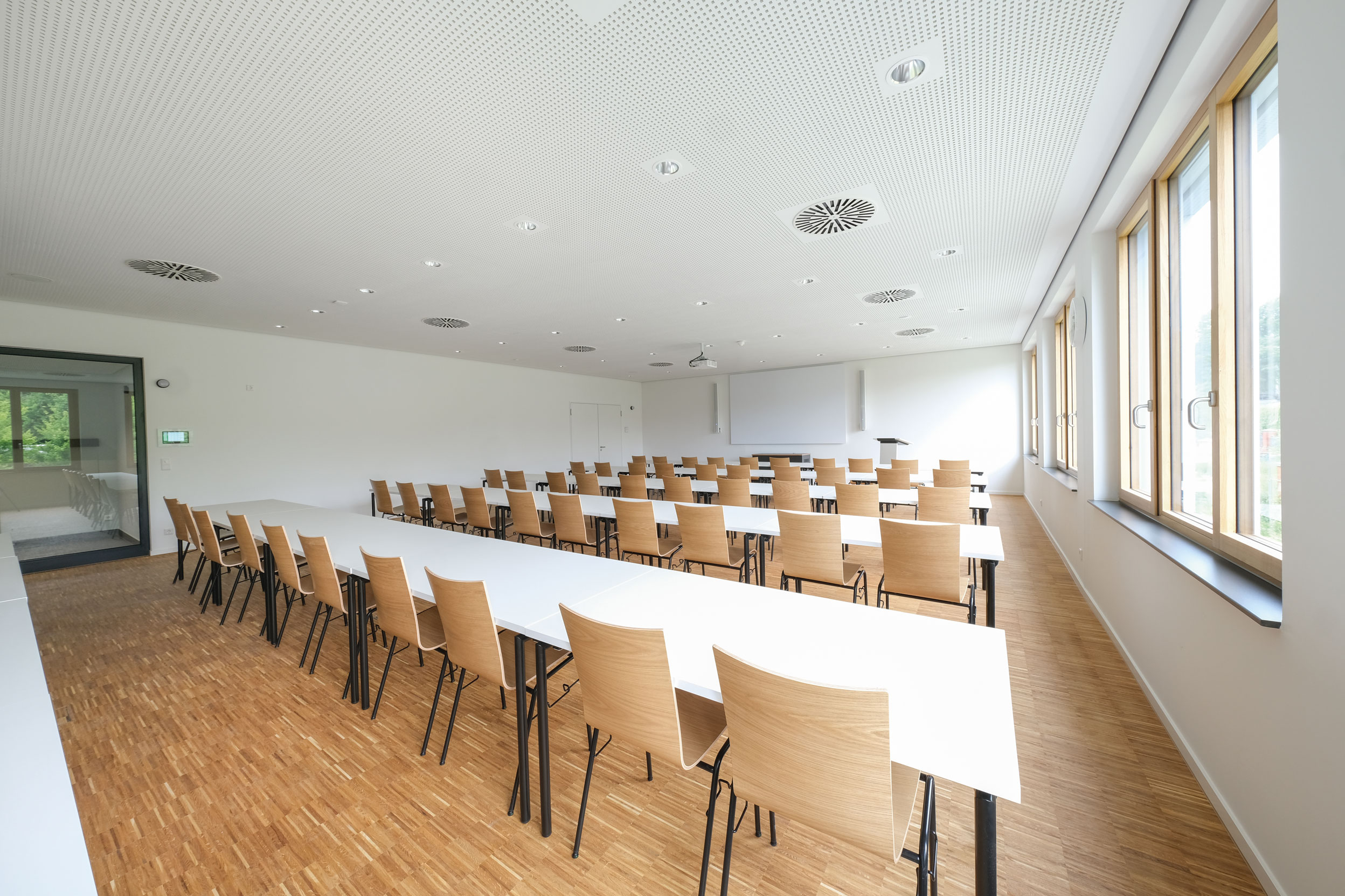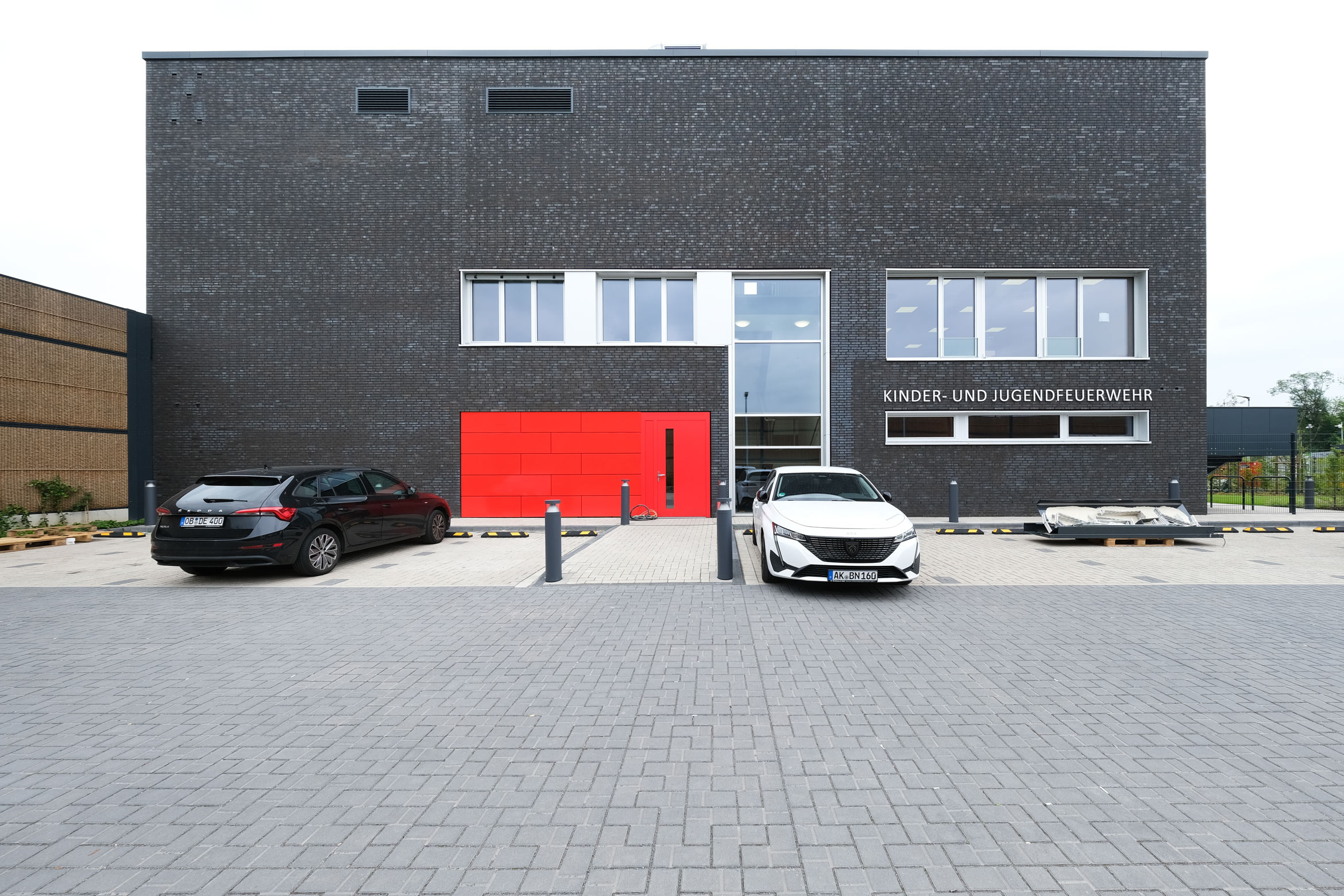 Auf einem rund 30.000 m² großen Grundstück ist ein zweigeschossiger Gebäudekomplex mit einer Bruttogeschossfläche von über 8.000 m² entstanden. Er besteht aus zwei T-förmig angeordneten Riegeln und einem 15 Meter hohen Übungsturm. Die funktionale Aufteilung deckt sämtliche Anforderungen eines modernen Feuerwehr- und Rettungszentrums ab: Es gibt Fahrzeughallen mit insgesamt 26 Stellplätzen, Werkstätten, Wasch- und Desinfektionsbereiche, Lagerflächen sowie umfassende Sozial-, Aufenthalts-, Schulungs- und Verwaltungsräume. Das Raumkonzept wird durch Sport- und Fitnessbereiche sowie eine leistungsfähige Einsatzzentrale ergänzt.