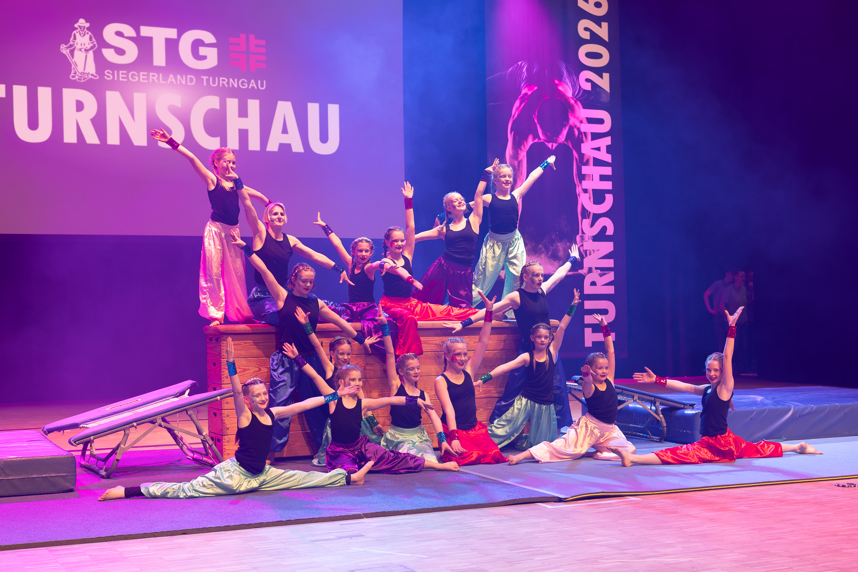 Den Auftakt machten rund 130 Kinder aus den Turnbezirken. Ein starkes Zeichen für den Nachwuchs, das die Stimmung im Saal von Beginn an anheizte. Im weiteren Verlauf präsentierte die Turnschau das gesamte Spektrum des Turnsports: Trampolin, Parkour und Rhönrad verschmolzen in einer gemeinsamen Inszenierung des TV Gosenbach, des TV „Jahn“ Siegen und des ESV Finnentrop zu einem dynamischen Bühnenbild. Große Tanzformationen, darunter die Alcher Turngemeinschaft mit mehr als 70 Tänzerinnen und die Gruppe des VTV Freier Grund, setzten ebenso Akzente wie die farbenprächtige Bollywood-Show und die Gymnastikvorführungen des TV „Eintracht“ Dreis-Tiefenbach. Traditionsreiche Disziplinen überzeugten mit Präzision und Eleganz: Die Kunstradfahrer des TV „Jahn“ Siegen, die Rhönradturnerinnen der TG „Friesen“ Klafeld-Geisweid und die Gerätturner des VTB Siegen und der Sportfreunde Birkelbach begeisterten mit Technik und Dynamik. Für besondere Höhepunkte sorgten zudem der ehemalige Vize-Europameister und vierfache Olympiateilnehmer Andreas Toba, die Bundesligamannschaft der SKV und die Rope-Skipping-Showgruppe „Burning Ropes“ aus Ottersweier sowie die Sportakrobatinnen des KSV Baunatal. Das große Finale mit rund hundert Mitwirkenden vereinte die Energie des Abends zu einem eindrucksvollen Schlussbild.