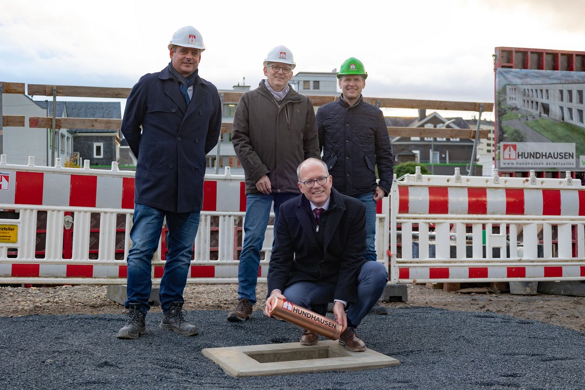 Am 7. November feierte die Bauunternehmung Hundhausen die Grundsteinlegung der neuen Hauptverwaltung in Siegen-Weidenau. Das Gebäude entsteht als Plus-Energie-Gebäude aus Stahlbeton-Fertigteilen. Beste Wärmespeicherung, minimaler Wärmeverluste und geringer Einsatz von Energie sind die Grundpfeiler des Konzeptes. Daraus resultieren eine intelligent gesteuerte natürliche Belüftung und der Verzicht auf technische Klimatisierung. Die nur im geringen Maße notwendige Heizung oder Kühlung wird durch Wärmepumpen und Betonkernaktivierung erreicht. Photovoltaikanlagen stellen dazu einen großen Teil des Strombedarfs zur Verfügung. Das zweigeschossige, teilunterkellerte Gebäude entsteht gegenüber dem bisherigen Büro am Stockweg.