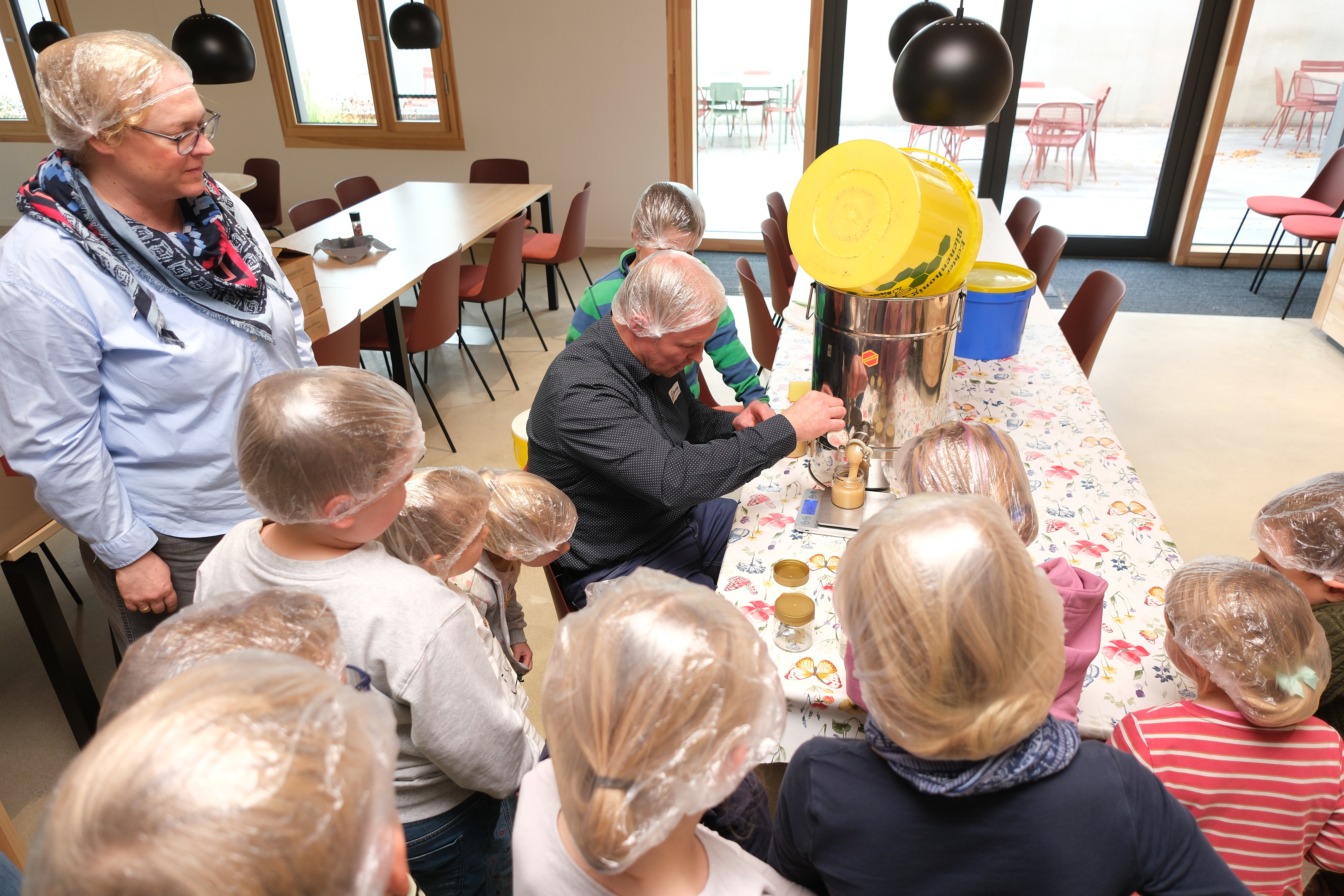 Der 12-jährige Sohn unseres Imkers erklärte mit viel Begeisterung, wie ein Bienenstock aufgebaut ist, welche Aufgaben die Bienen im Volk übernehmen und was ein Imker braucht, um Honig zu gewinnen. Ein besonderes Highlight war die Live-Honigabfüllung. Dabei durften die Kinder den Honig nicht nur hautnah erleben, sondern ihn auch kosten. Zum Abschluss wurde noch fleißig gebastelt. Aus duftenden Honigwaben entstanden kleine Kerzen, die die Kinder voller Stolz mit nach Hause nahmen.