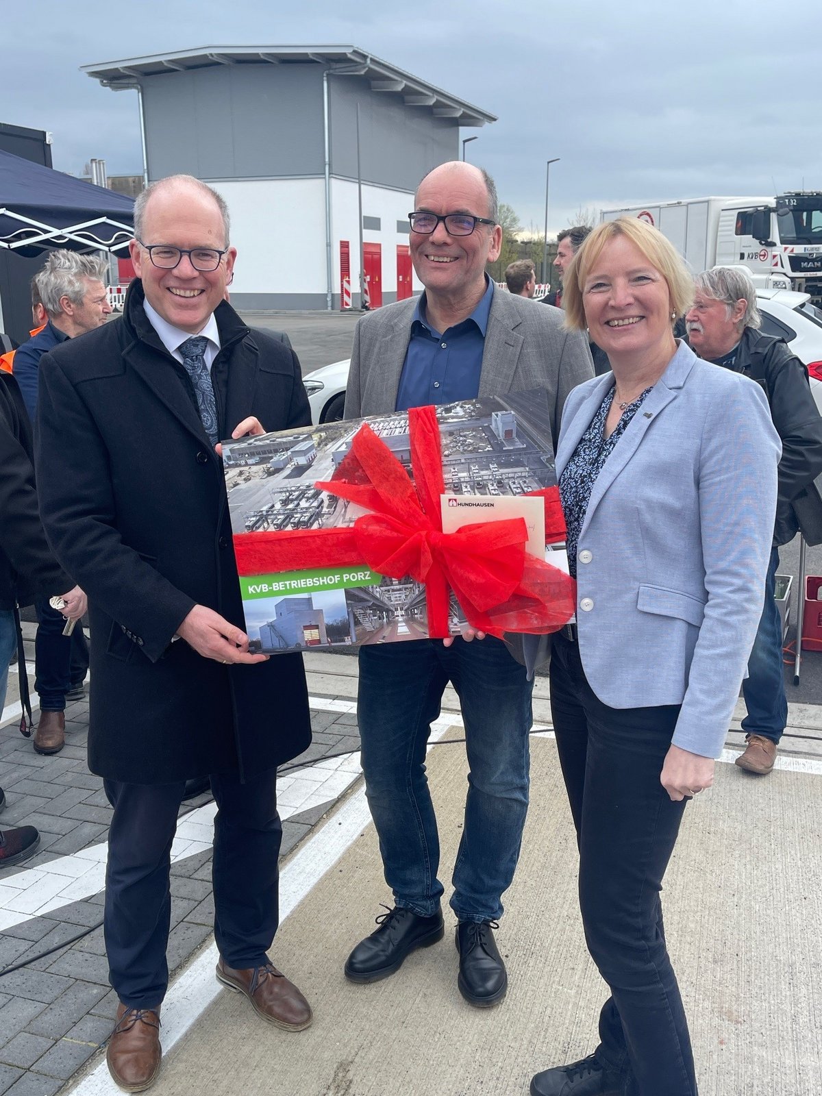 Zur heutigen feierlichen Eröffnung gratulierte Stephan Hundhausen und überreichte Frau Haaks (Vorstandsvorsitzende KVB) und Herrn Grüwell (Projektleiter KVB) ein schönes Andenken in Form eines Wandbildes.