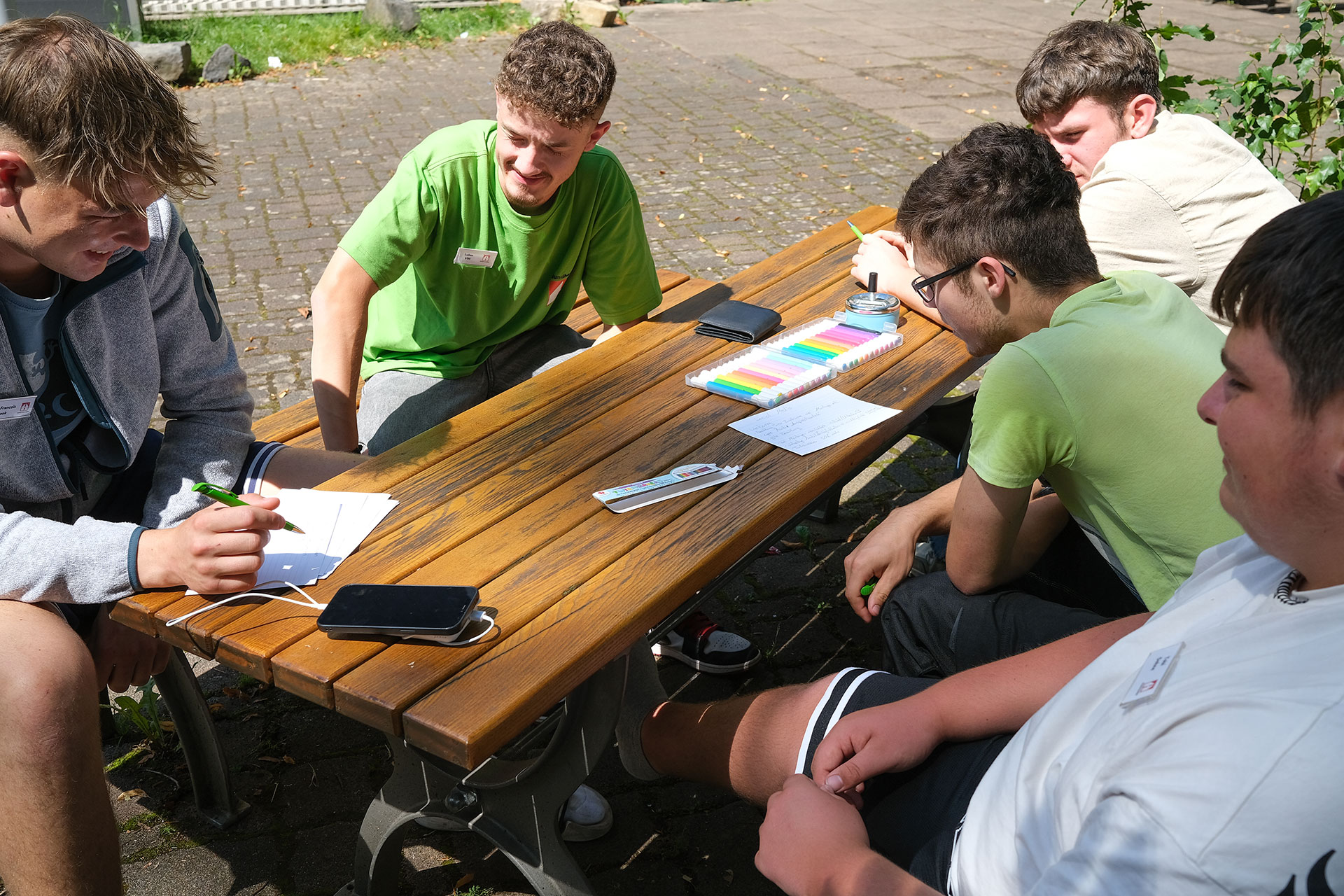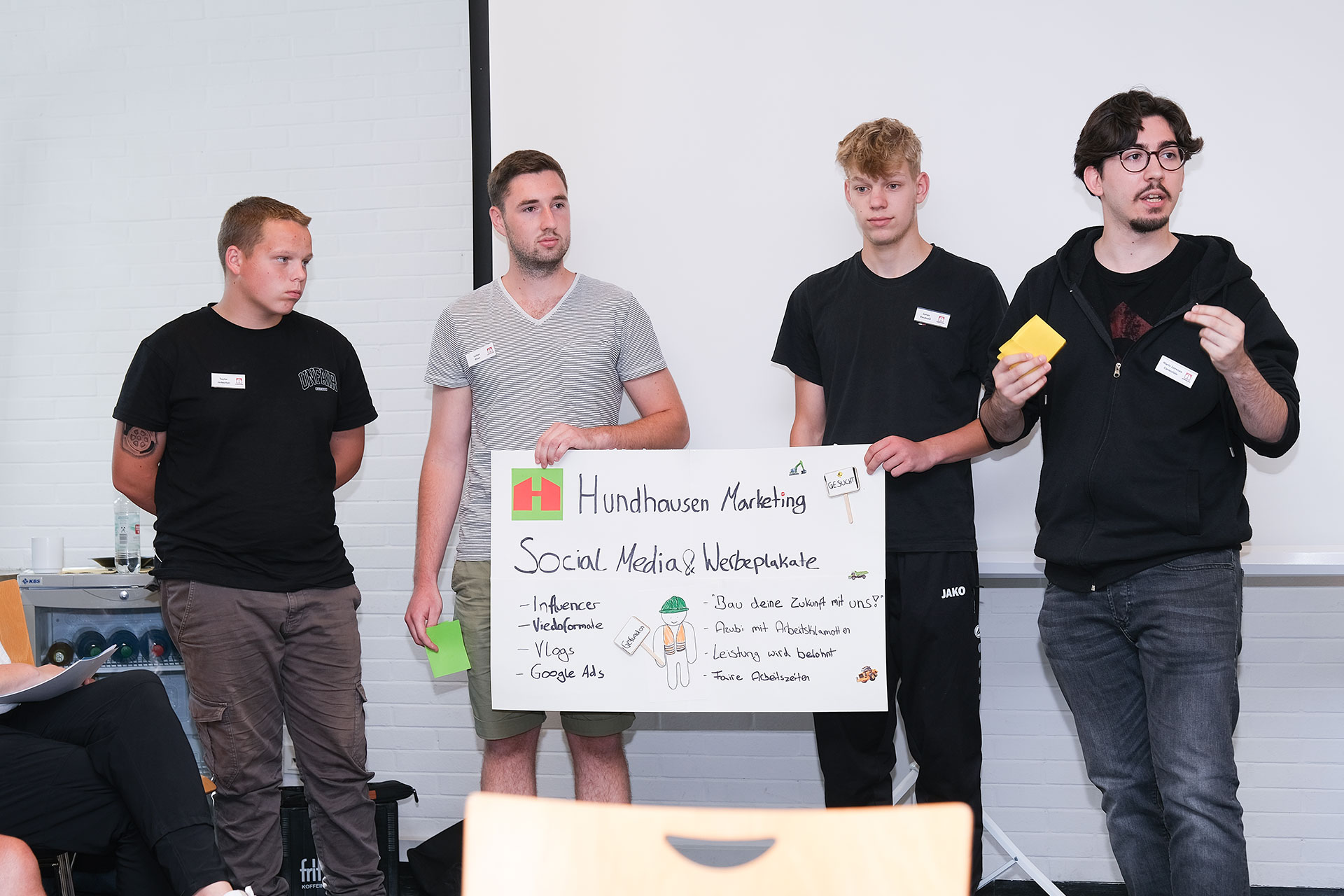Am Nachmittag besuchten Herr Stephan Hundhausen und Herr Wilhelm Hundhausen den Workshop, um mit den Teilnehmern eine weitere Gruppenaufgabe zu bearbeiten. Bei strahlendem Sonnenschein erarbeiteten die Nachwuchskräfte auf der Terrasse kreative Plakate zum Thema „Marketing des Unternehmens“. Nach den Präsentationen der einzelnen Gruppen gaben die Herren Hundhausen wertvolles Feedback und motivierende Worte mit auf den Weg.